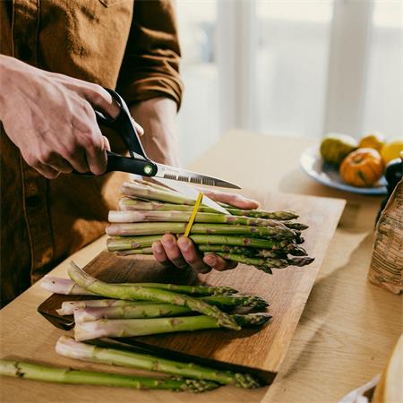 A Fiskars Functional Form ReNew 21 cm-es konyhai olló egy megbízható, sokoldalú eszköz a mindennapi konyhai feladatokhoz. Kifejezetten élelmiszerek és csomagolóanyagok vágására tervezték: könnyedén elbánik zöldfűszerekkel, húsokkal, zöldségekkel, konyhai fóliával vagy zacskókkal is.
